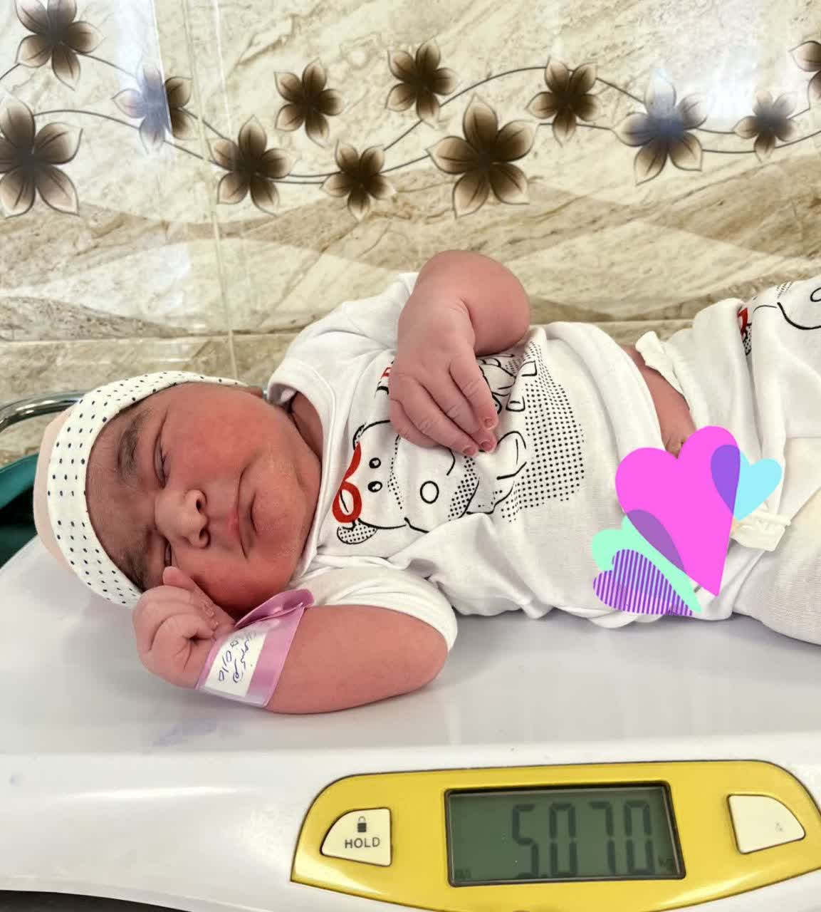 نوزاد پنجم خانم ۴۲ سالهای با وزن ۵ کیلوگرم و با زایمان طبیعی در اتاق زایمان بیمارستان افشار به دنیا آمد. حال عمومی مادر و فرزند، خوب است و نوزاد از شیر مادر تغذیه میشود.