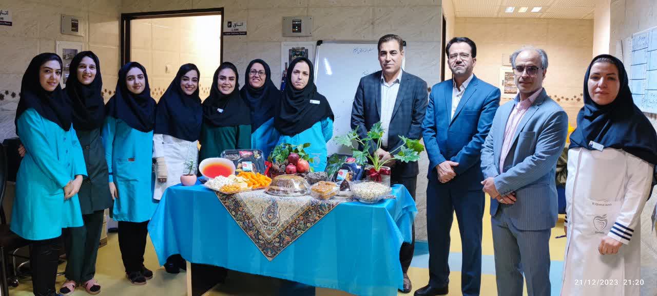 دکتر حسن حقانینژاد رئیس بیمارستان، دکتر عباسعلی معظمی مدیریت، محمدعلی مهیجی مترون و فاطمه عمرانی سوپروایزر بیمارستان با حضور در بخش های فعال بیمارستان، یلدا را به همکاران تبریک و خداقوت گفتند. در این بازدید تیم مدیریت از بیماران عیادت کردند و یلدا را به آنها تبریک گفته و برایشان ارزوی سلامتی کردند. لازم به ذکر است پکیجهای یلدایی نیز همراه با شام به پرسنل اهدا شد.