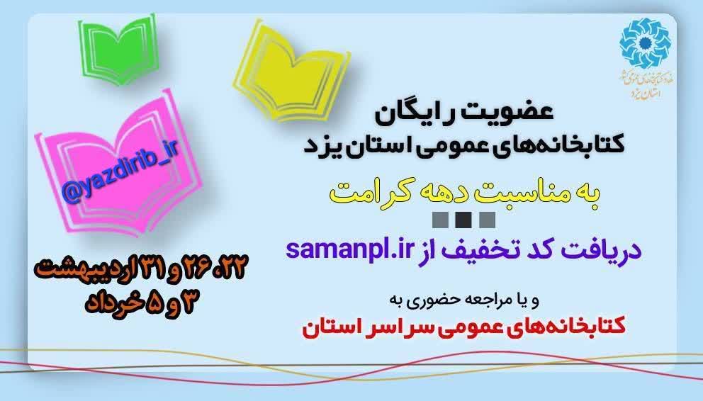 به مناسبت دهه کرامت، طرح عضویت رایگان در روزهای۲۲، ۲۶ و ۳۱ اردیبهشت ماه و همچنین ۳ و ۵ خردادماه ۱۴۰۳ در تمامی کتابخانه‌های عمومی شهرستانهای استان یزد اجرا می‌شود. مراجعین برای استفاده از این طرح می‌توانند از طریق پرتال کتابخانه موردنظر کد تخفیف را دریافت کرده یا بصورت حضوری به کتابخانه‌های عمومی تمامی شهرستان های استان یزد مراجعه کنند.